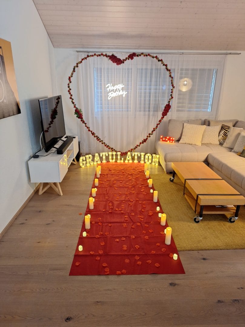 - eine kunstvolle "Happy Birthday" bzw. "Gratulation" Überraschungsdekoration (CHF 200.-)